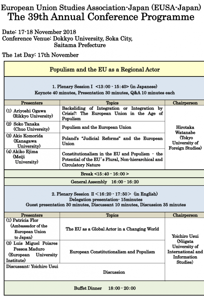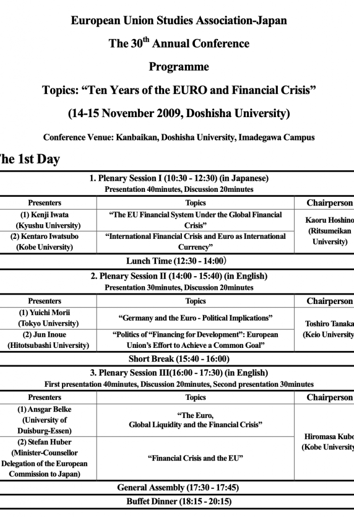 Conference 45th Research Conference Exploring the role of the EU as a global standard-setter Asia University 44th Research Conference Ukraine Issues and the EU Aichi University 43rd Research Conference The Future of Europe and Civil Society Tokyo Keizai University 42ed Research Conference Recovery Strategy for Europe after Covid-19: The Potential of the European Green Deal Online (Zoom Webinar) 41st Research Conference, 2020 EU-Japan Relations in the Multipolar Era: How EU-Japan EPA/SPA matter in the World? Online (Zoom Webinar) 0th Research Conference, 2019 EU in a Changing Era – in Search for New Integration Kobe University 39th Research Conference, 2018 Populism and the EU as a Regional Actor Dokkyo University 38th Research Conference, 2017 The Treaties of Rome at 60: Critical Reflections Kyushu University 37th Research Conference, 2016 Area of Freedom, Security and Justice: Refugees, Terrorism and the EU Hitotsubashi University 36th Research Conference, 2015 The EU and Asia: Significance of Mutual Interests Kansai University 35th Research Conference, 2014 Solidarity in the European Union Rissho University 34th Research Conference, 2013 The Euro Crisis and the Future of the EU Ritsumeikan University 33th Research Conference, 2012 The EU as a Global Actor University of Tokyo 32th Research Conference, 2011 Globalization and European Integration Reviewed: Approaching the 20th anniversary of the Internal Market Matsuyama University 31th Research Conference, 2010 Lisbon Treaty and its Challenges for the EU Aoyama Gakuin University 30th Research Conference, 2009 Ten Years of the EURO and Financial Crisis Doshisha University 9th Research Conference, 2008 The EU Environmental Governance and the Globalised World University of Shizuoka 28th Research Conference, 2007 The 50 Years of Treaty of Rome: The Achievements and Perspectives Kobe University 27th Research Conference, 2006 Challenges for Future European Integration Tokyo University of Foreign Studies 26th Research Conference, 2005 The EU and Governance Kyushu University 25th Research Conference, 2004 The IGC and the European Constitution Waseda University 24th Research Conference, 2003 Enlargement of the EU and Its Implications Hokkaido University 23th Research Conference, 2002 The Euro Revisited Nihon University 22th Research Conference, 2001 The Treaty of Nice and the Future of Europe Nagasaki Junshin Catholic University 21th Research Conference, 2000 Theoretical and Historical Analysis on European Integration: In commemoration of the 50th Anniversary of the Schumann Declaration Kindai University 20th Research Conference, 1999 The EU moving towards the 21st Century Keio University